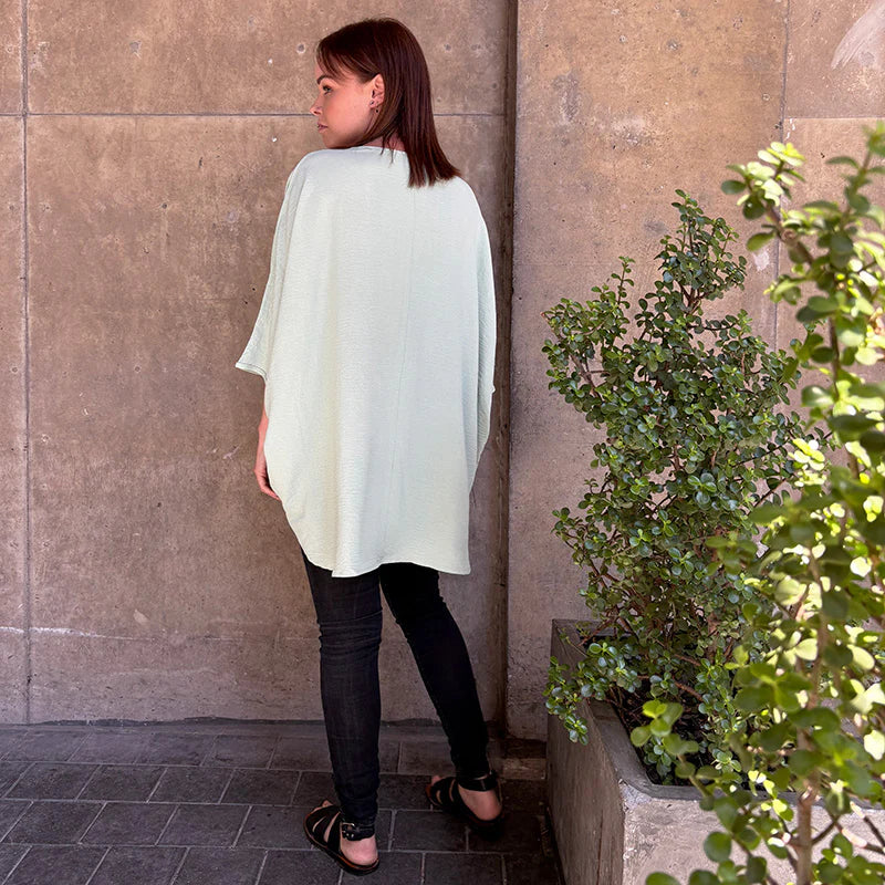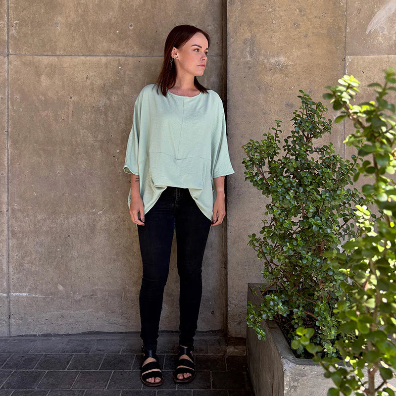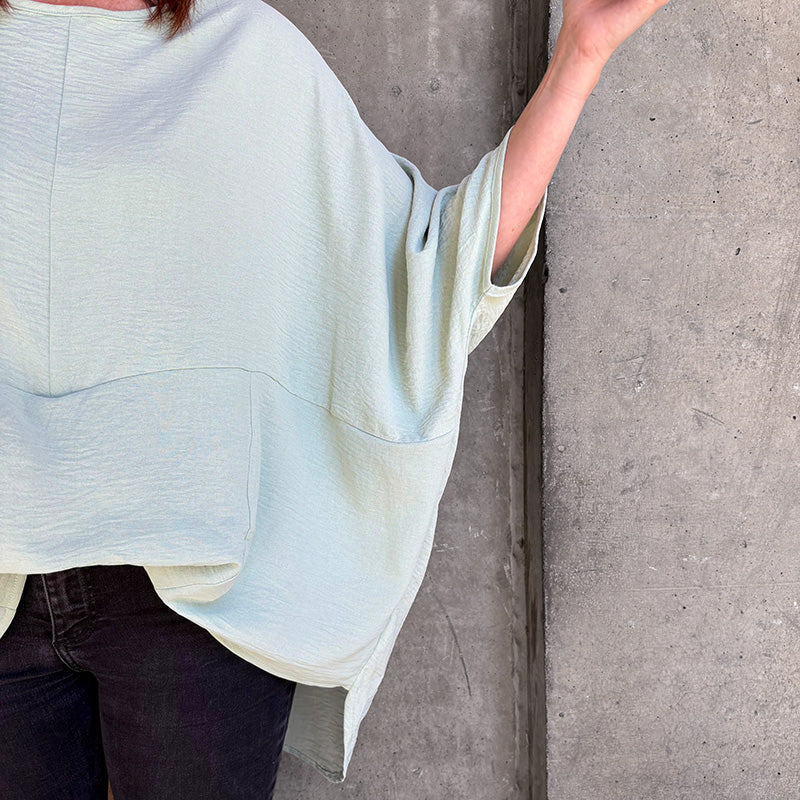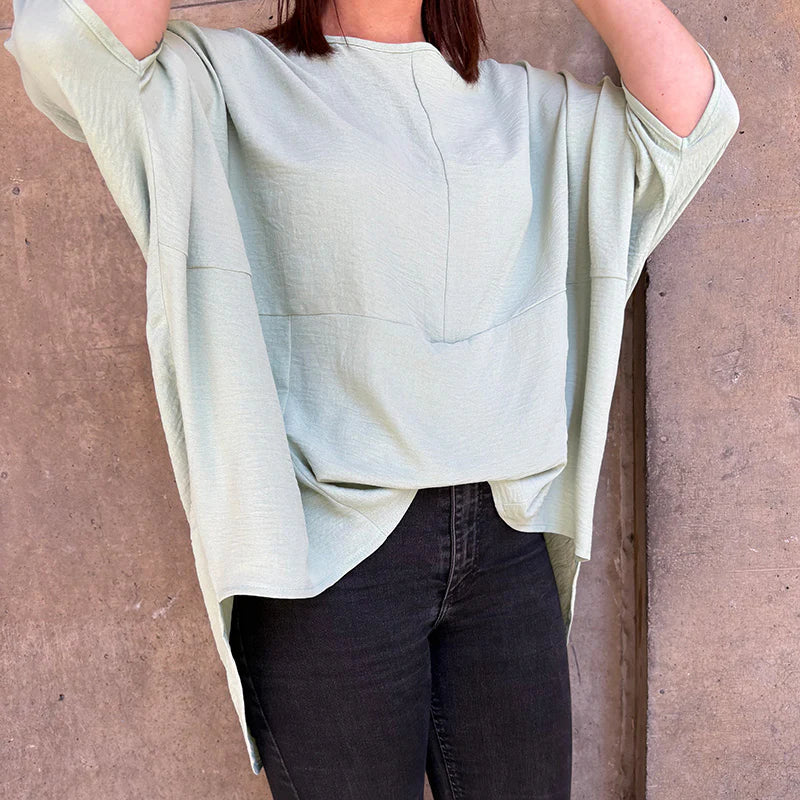 Japanese inspired folded top. High-low hemline with folded panel front detail. Flowy top that looks great paired with jeans or black fitted leather pants.